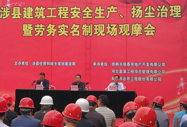 住建局局長張玉斌對我公司在御湖天城建筑安全施工、揚(yáng)塵整治暨勞務(wù)實(shí)名制的做法,給予高度肯定。 他表示,我們公司在安全管理、揚(yáng)塵治理及勞務(wù)實(shí)名制的做法為涉縣其他各單位的現(xiàn)場安全管理、揚(yáng)塵治理及有效地維護(hù)農(nóng)民工權(quán)益指明了方向和途徑。