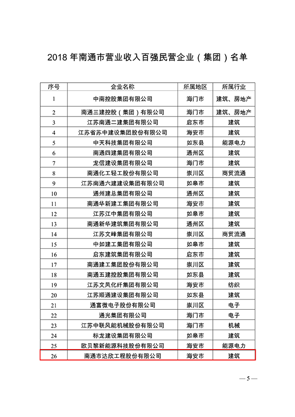4月23日,南通市工業(yè)和信息化局發(fā)布關(guān)于2018年南通市營業(yè)收入百強(qiáng)民營企業(yè)(集團(tuán))情況的通報(bào)。南通市達(dá)欣工程股份有限公司以出色的業(yè)績榮登百強(qiáng)企業(yè)榜單,列26位,排名海安第5位(海安共有26家入圍)。