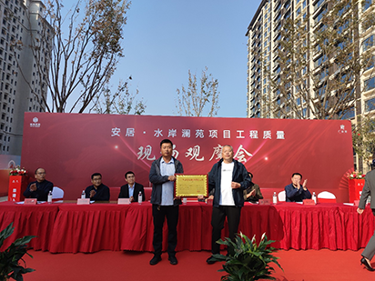 10月19日,第三工程公司承建的安居?水岸瀾苑項(xiàng)目工程質(zhì)量現(xiàn)場(chǎng)觀摩會(huì)暨廣平縣2023年度建設(shè)質(zhì)量樣板工程頒獎(jiǎng)儀式隆重舉行。邯鄲市建筑工程質(zhì)量管理站副站長(zhǎng)徐金峰、張少軍科長(zhǎng)、廣平縣建筑工程質(zhì)量監(jiān)督站,廣平縣在建工程各施工單、監(jiān)理單位、地產(chǎn)開(kāi)發(fā)商代表等120余人參加活動(dòng)。安居?水岸瀾苑項(xiàng)目經(jīng)理吉光代表公司接受“2023年度建設(shè)質(zhì)量樣板工程”獎(jiǎng)牌。